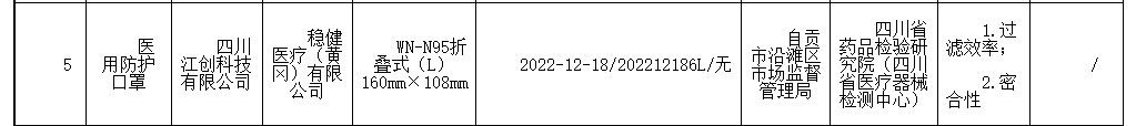 标示医疗器械注册人、备案人为稳健医疗(黄冈)有限公司的医用防护口罩(规格/型号:WN-N95折叠式(L)160mm×108mm;生产日期/批号/出厂编号:2022-12-18/202212186L/无)不合格项目为1.过滤效率;2.密合性。被抽样单位为四川江创科技有限公司,检验机构为四川省药品检验研究院(四川省医疗器械检测中心)。