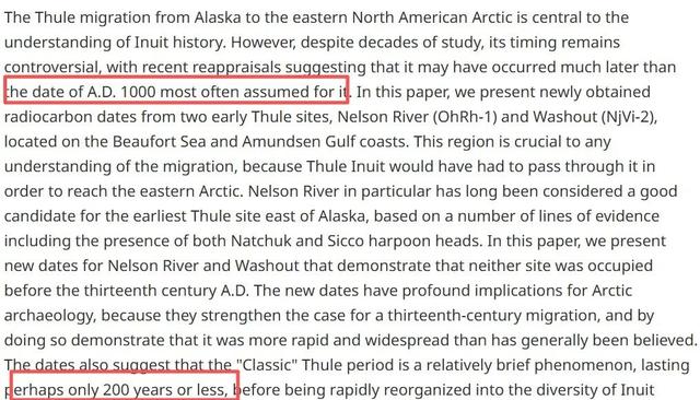图勒人从白令海峡迁徙到北美东部北极地区的时间也是理解古因纽特人历史的关键,然而,目前其迁徙时间仍存在争议。