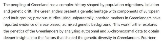 《自然》杂志2014年发布的《格陵兰岛人口起源:利用常染色体和X染色体标记分析遗传多样性的进一步见解》(The peopling of Greenland: further insights from the analysis of genetic diversity using autosomal and X-chromosomal markers)