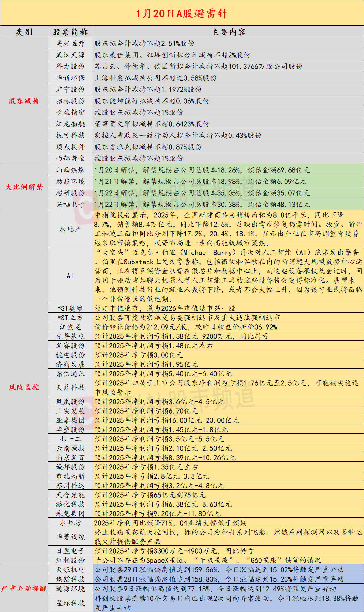 导读:财联社1月20日投资避雷针,近日,A股及海外市场潜在风险事件如下。国内经济信息方面包括:1)国内商品期市夜盘多数下跌,黑色系跌幅居前焦炭跌2.48%;2)2025年全国新建商品房销售面积同比下降8.7%,需求修复仍需时间;公司方面重点关注包括:1)*ST奥维(维权)锁定市值退市,或为2026年市值退市第一股;2)*ST立方(维权)公司股票可能被实施交易类强制退市及重大违法强制退市;海外市场重点关注包括:1)特朗普再掀贸易摩擦,欧洲主要股指收盘集体下跌;2)“大空头”再次对AI泡沫发出警告,行业或将面临漫长低迷期。