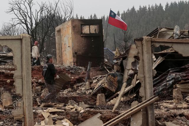 1月19日,当地居民在智利比奥比奥大区彭科市的火灾受灾区域进行清理。