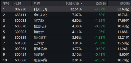软件50ETF(159590)标的指数权重股多数飘绿:科大讯飞跌超3%,金山办公、同花顺、指南针、润和软件、三六零跌超1%,恒生电子、拓维信息、深信服微跌。