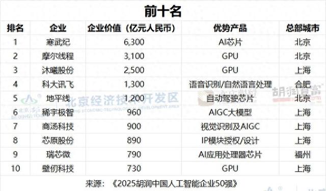 据悉,《2025胡润中国人工智能企业50强》榜单聚焦于主营业务为AI算力或算法的中国企业,主要按照企业价值进行排名,上市公司市值按照2026年1月9日的收盘价计算,非上市公司估值参考同行业上市公司或者根据最新一轮融资情况进行估算。