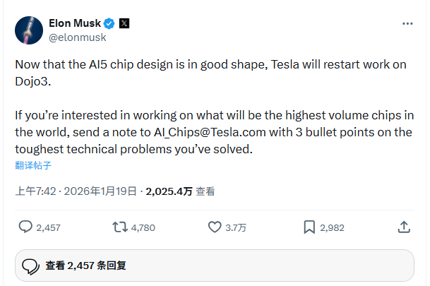 马斯克在最新帖子中指出,基于AI5芯片设计进展顺利的现状,公司决定重启Dojo。他还发布“招聘启事”,邀请对“研发世界上产量最高芯片”感兴趣的工程师加入,并要求应征者用三个要点简述其解决过的关键技术难题。