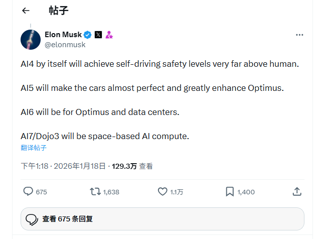 在最新帖子中,马斯克写道:“AI7/Dojo3将用于太空人工智能计算。”这一规划呼应了他去年提出的一个颠覆性的愿景:将AI计算中心部署到太空。
