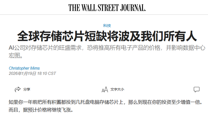 《华尔街日报》则发文称,如果你一年前把所有积蓄都投到几托盘电脑存储芯片上,那么到现在你的投资至少增值一倍,而且预计价格将继续飞涨。