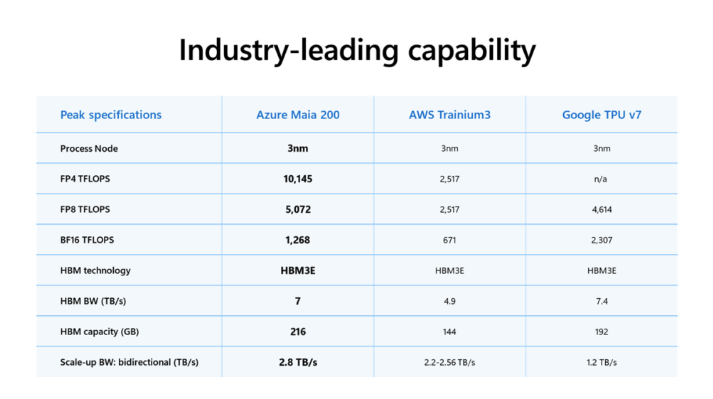 微软在公告中表示,这款“为推理而生”的芯片在多项测试中超越亚马逊的第三代Trainium和谷歌第七代TPU。因此,微软将Maia 200公开称为“所有超大规模云服务商中性能最强的自研芯片”。