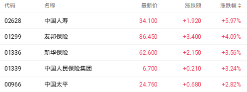 截至收盘,中国人寿(02628.HK)涨5.97%、友邦保险(01299.HK)涨4.09%、新华保险(01336.HK)涨3.56%。