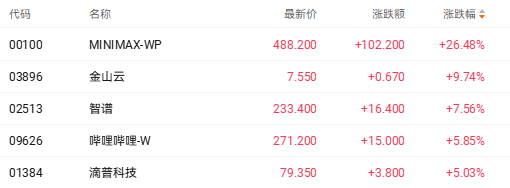 截至收盘,MINIMAX-WP(00100.HK)涨26.48%、金山云(03896.HK)涨9.74%、智谱(02513.HK)涨7.56%。