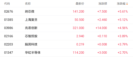截至收盘,纳芯微(02676.HK)涨5.61%、上海复旦(01385.HK)涨5.12%、兆易创新(03986.HK)涨3.89%。