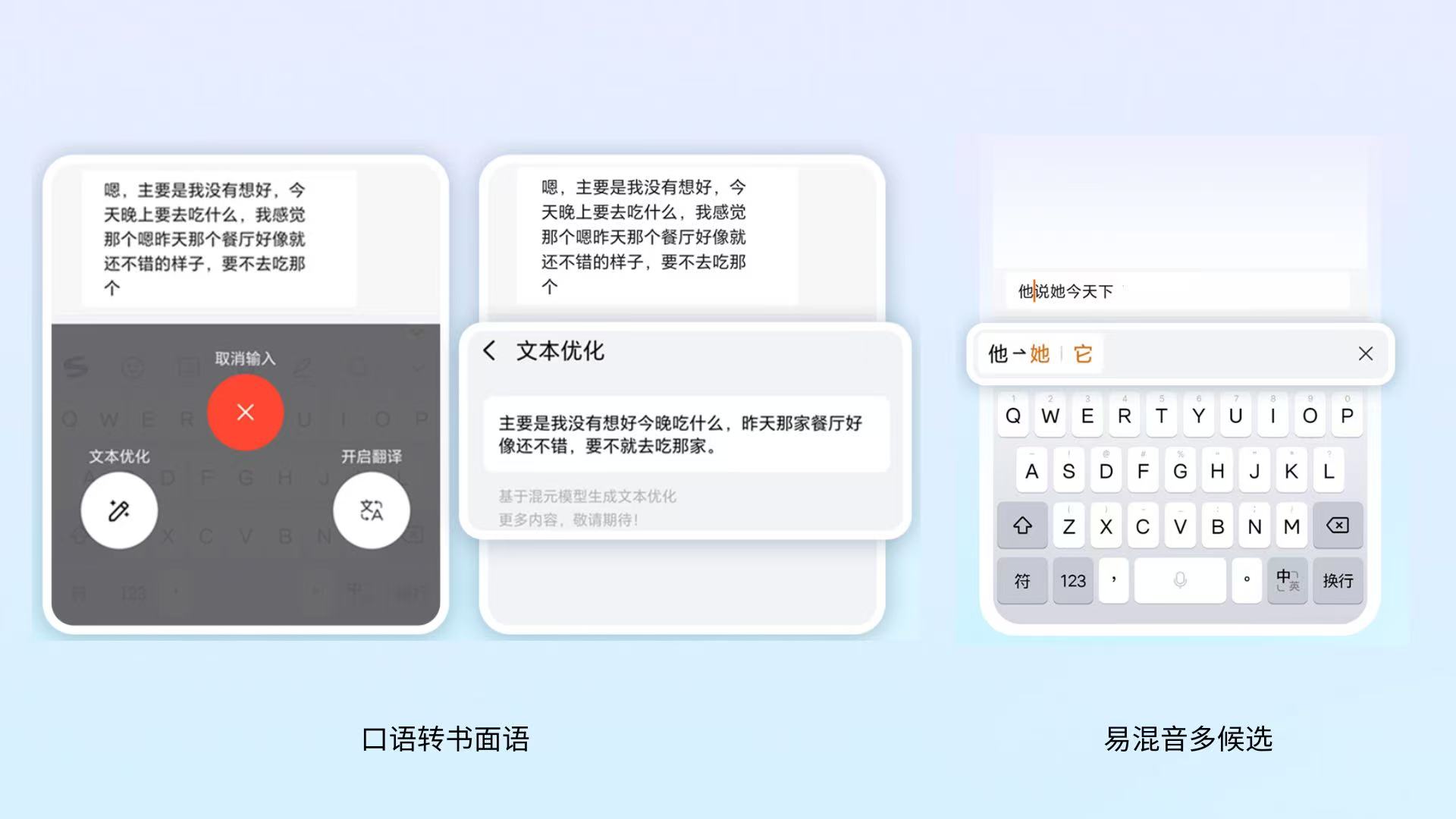 升级后的AI语音输入基于腾讯混元语音大模型,语音识别流畅性提升40%、整体准确率达98%,方言识别准确率提升30%。即便在20分贝以下的轻声场景,识别准确率仍保持97%,适配图书馆、办公室等私密场景。同时新增口语转书面语功能,可智能润色散乱语音内容,还能针对“他她它”等易混音问题提供智能候选替换。
