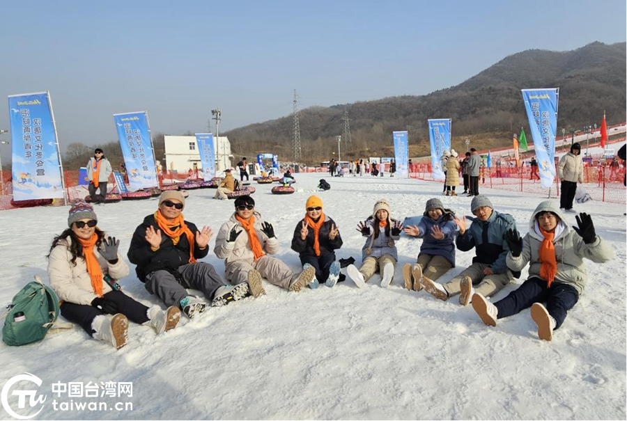 1月27日,2026海峡两岸青年汉唐文化冬令营在陕西省铜川市照金国际滑雪场开营。图为台湾青年在雪地合影留念。(中国台湾网记者 李宁 摄)