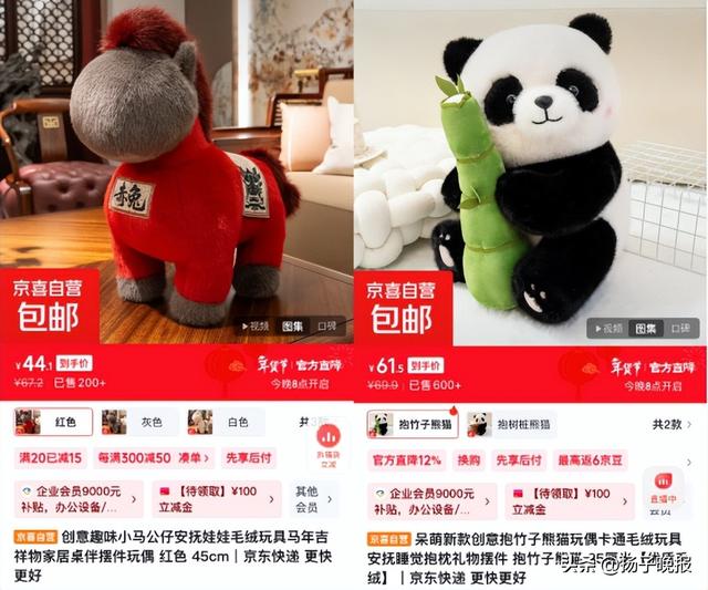 马年即将来临,京喜与来自河北产业带的德聚仁合打造毛绒小马公仔迎来销售爆发,红色“赤兔”、灰色“乌骓”、白色“的卢”,瞬间成为爆款;新款抱竹子熊猫毛绒玩具,造型设计憨厚可爱,毛绒面料触感柔滑,同样迎来热销。