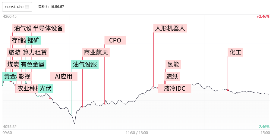 财联社1月30日讯,今日48股涨停,21股炸板,封板率为70%,湖南黄金5连板,百川股份3连板,天地在线10天6板,红宝丽9天4板。A股三大指数今日涨跌不一,个股跌多涨少,超2800股收跌。沪深两市成交额2.84万亿元,较上日缩量3945亿元。板块方面,农业、造纸、算力硬件、旅游酒店板块领涨;有色、油气、房地产等板块领跌。截至收盘沪指跌0.96%,深成指跌0.66%,创业板指涨1.27%,北证50指数跌0.29%。