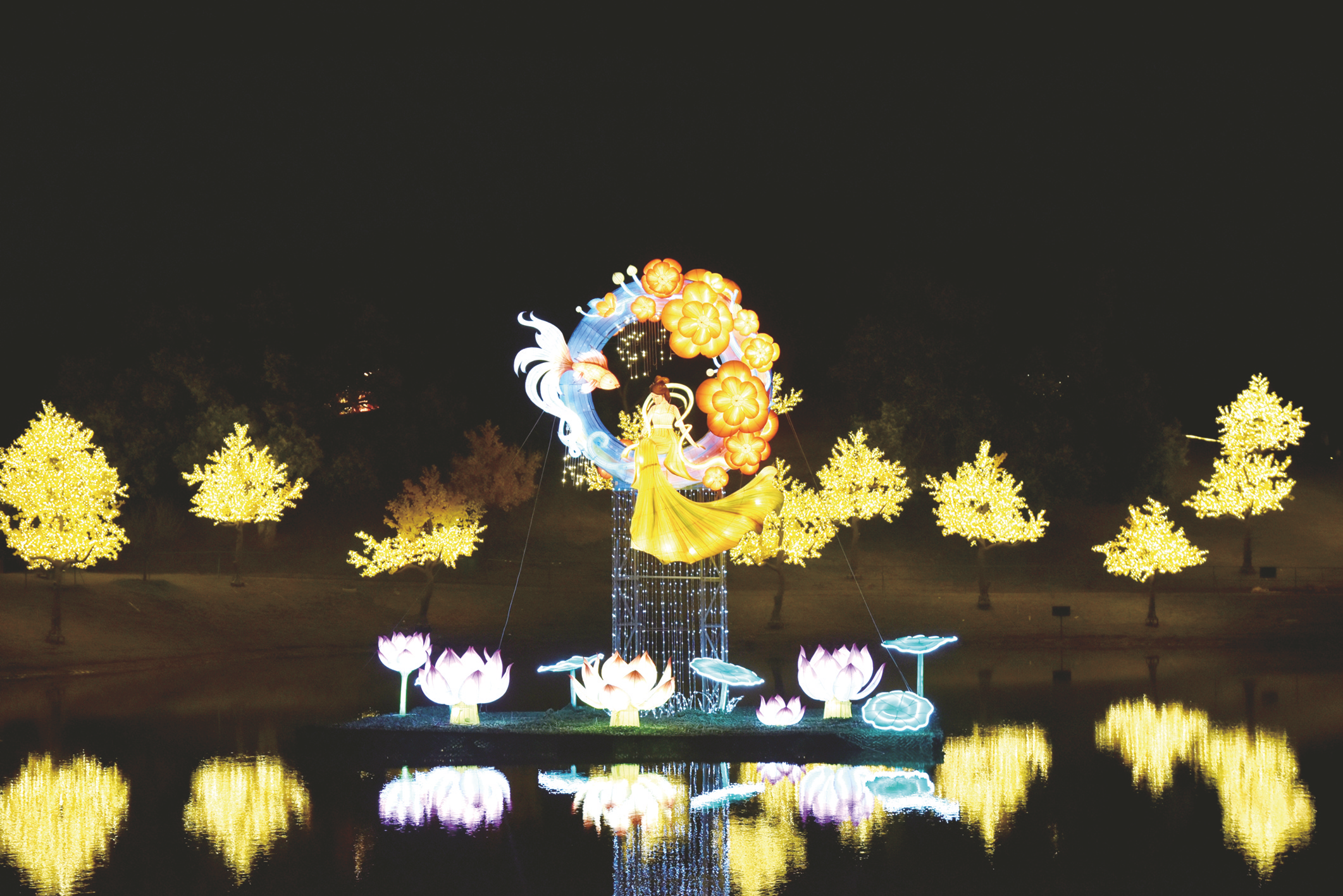 相较于往年,本届灯会在空间覆盖与内容设计上更显匠心,将青秀山的生态文化与马年的节庆元素巧妙融合,43组彩灯错落分布于水面、陆地和通道之间,每一组都传递着专属寓意与视觉惊喜。如承载祈福愿景的“财神大道”主题灯组;以巨龙动态造型搭配连续拱门的“龙腾盛世”通道氛围灯组;还有双凤华美造型融合绣球与鼓乐元素、尽显民族欢腾气韵的“双凤和鸣”灯组;超大型水面灯组“光驰八骏”以灵动逼真的奔腾姿态,成为灯海中最受瞩目的焦点。