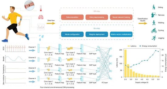 柔性芯片是否能像创可贴一样贴在人体表面,用于健康监测?研究人员之后将FLEXI用于日常活动的连续监测与识别,发现其在可穿戴健康监测和多模态传感器内计算中具有应用前景。他们采集了受试者在不同状态下的心率、呼吸频率、体温等多模态生理信号,构建了轻量级四通道卷积神经网络,并实现一次性片上部署。通过量化感知训练,该模型在测试集上实现了97.4%的分类准确率。