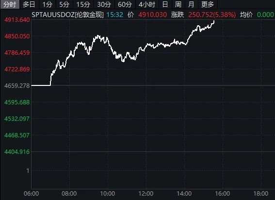 国际贵金属2月3日盘中拉升。纽约期金涨超5%,突破4900美元/盎司,现货黄金也涨超5%,重回4900美元/盎司。现货钯金向上触及1800美元/盎司,涨近8%。
