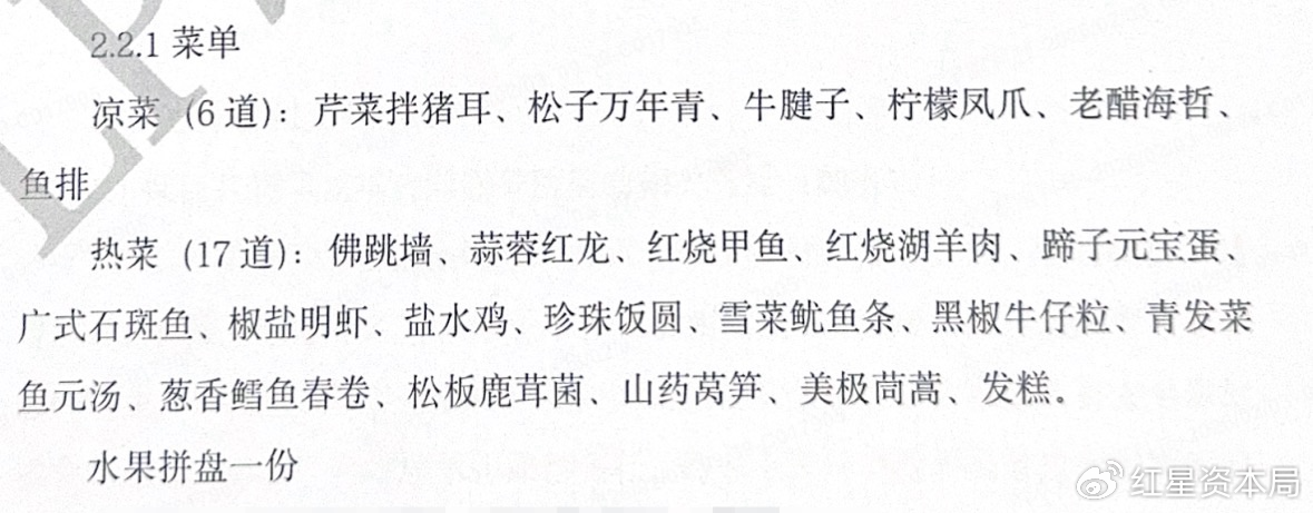 菜单显示,年会晚餐共有6道凉菜、17道热菜、1份水果拼盘,热菜中有佛跳墙、龙虾、甲鱼、石斑鱼等。
