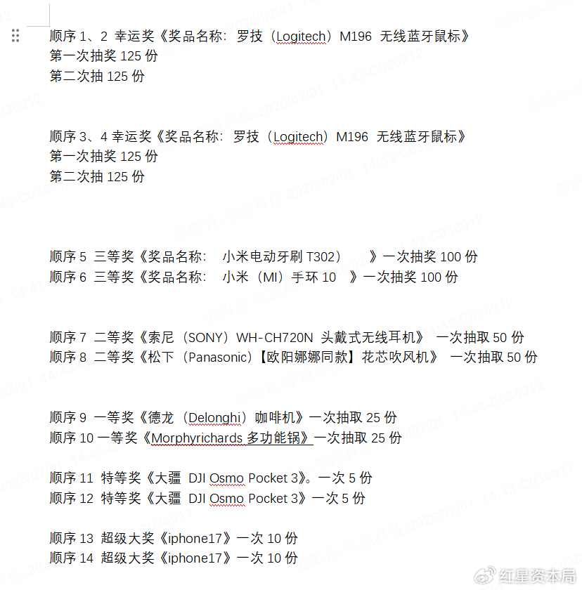 年会奖品分为幸运奖、三等奖、二等奖、一等奖、特等奖和超级大奖,分别为500份蓝牙鼠标、100份电动牙刷和100份手环、50份无线耳机和50份吹风机、25份咖啡机和25份多功能锅、10份大疆云台相机、20份iPhone17。