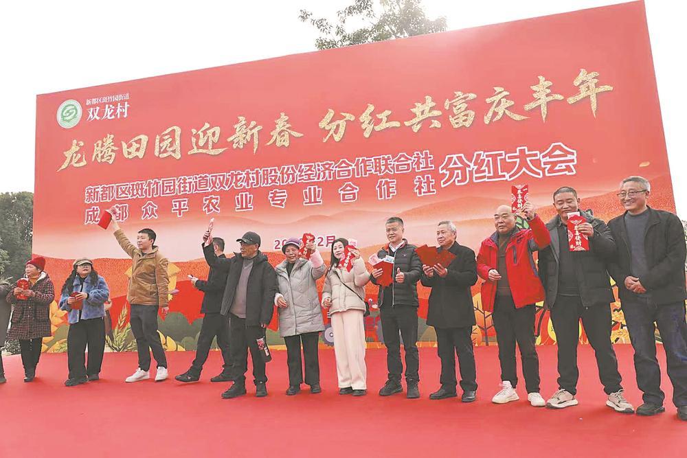 “分红了!还有礼品!”2月4日下午的暖阳,让新都区斑竹园街道双龙村漫野音乐营地的草坪上格外温暖。双龙村2026年分红大会在这里举行,大红的对联、喜庆的福字、欢快的音乐、热闹的游戏,以及用40余万元堆成小山的现金,构成了一幅集体经济带动共同富裕,村民在家门口就业增收的幸福图景。