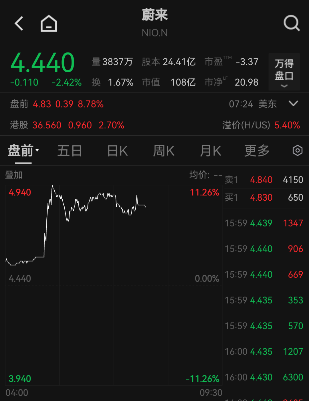 北京时间2月5日晚间,蔚来公司(证券代码:NIO.N)在美股盘前一度涨超11%。