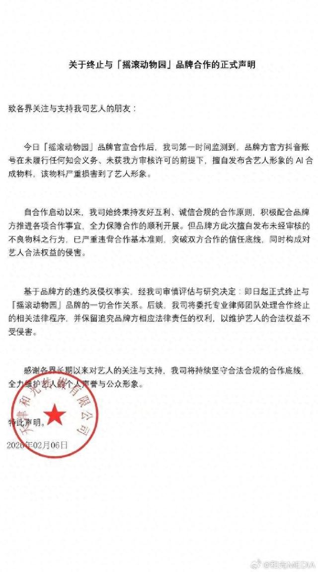 2月6日下午,天津和光传媒发布的与品牌“摇滚动物园”终止合作的正式声明登上热搜。品牌“摇滚动物园”发布了代言艺人云旗、郝熠然形象的AI合成视频,引起了粉丝的强烈不满,认为该视频内容很差,损害艺人形象。和光传媒在声明中表示,公司注意到品牌方在未履行任何知会义务、未获公司审核许可的前提下,擅自发布含艺人形象的AI合成物料,该物料严重损害了艺人形象,因此决定终止与“摇滚动物园”的合作。随后,“摇滚动物园”也发文道歉。