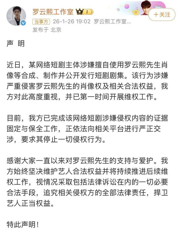 近两周时间内已经接连出现多起因艺人AI形象引发的争议性事件了,2月4日,某唇部精华品牌被消费者发现疑使用AI赵露丝、AI白鹿、AI田曦薇推荐相关品牌产品,实际上这些艺人都没有推荐过该产品,视频素材是从这些艺人其他活动中截取,通过AI合成技术替换了声音和手部动作制作而成,当前相关视频已经被下架。2月3日,艺人王楚然工作室发布了使用AI技术合成王楚然形象并宣传新剧的视频,也引起了粉丝的强烈不满,认为该视频制作粗糙,AI王楚然看上去十分诡异,随后工作室悄悄的删掉了这条视频。1月底,有网友在网上刷到了一部短剧,其中男主角面孔与罗云熙相似度极高,形象与罗云熙代表作《长月烬明》中“澹台烬”的经典造型类似,被认为是AI生成的内容,1月26日晚,艺人罗云熙工作室发出声明,表示近日某短剧涉嫌擅自使用罗云熙肖像合成、制作并发公开发行短剧剧集,该行为涉嫌严重侵害罗云熙的肖像权及相关合法权益,工作室开展维权工作。