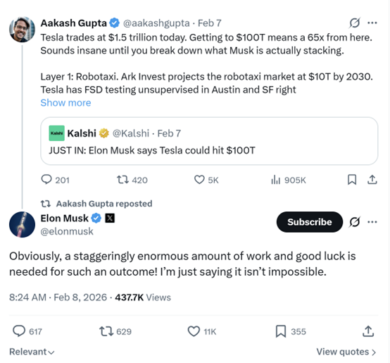 更有激进的特斯拉投资者认为,特斯拉市值有望达到100万亿美元。尽管这一数字听起来近乎离谱,但特斯拉首席执行官埃隆·马斯克认为,这并非完全不可能实现。