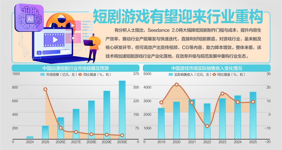 值得关注的是,这一技术突破已快速传导至资本市场,2月10日A股市场上演AI相关板块狂欢,同花顺数据显示,影视院线板块单日大涨11.31%,Sora概念、短剧游戏、文化传媒等相关板块同步跟涨,读客文化、中文在线等多只个股实现20%涨停,上海电影、光线传媒等个股强势封板。这不禁让人联想到去年春节前DeepSeek(DS,深度求索)引爆AI概念的行情,如今字节跳动Seedance2.0(SD)的爆火,再度点燃场内资金对AI应用领域的关注,被市场解读为A股的“SD时刻”。机构分析指出,Seedance 2.0在多模态视频生成领域的功能质变,大幅降低了AI漫剧、短剧等内容的制作成本与技术门槛,将有效提升生产效率,成为驱动相关板块上涨的核心催化因素,而这一技术与市场的联动,也预示着AI多模态应用的产业化落地正在加速,同时也给市场带来了对行业重构、版权规范及短期行情分歧的深层思考。