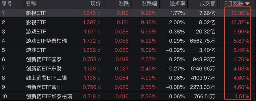 Seedance2.0从影视圈到投资圈落地仅用了两天。这一波AI应用率先在传媒领域点燃,2月9日,AI应用端集体发力,10日,传媒板块全线爆发。从近5日涨幅榜来看,影视ETF涨幅超过16%,AI应用相关的游戏ETF、创新药ETF涨幅居前。