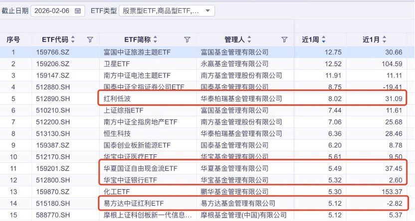 以2月2日至6日市场资金流向来看,资金流向已经不仅仅在卫星、电池等赛道领域,华泰柏瑞红利低波ETF、华宝自由现金流ETF、华宝银行ETF以及易方达红利ETF等产品获得资金持续买入。