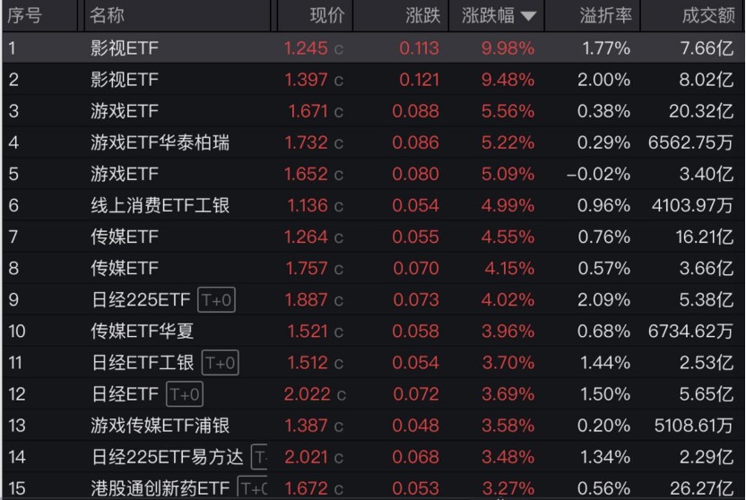 2月10日,AI影视概念继续火热,传媒板块持续全天领涨,影视ETF、游戏ETF、传媒ETF领涨全市场,其中,2只影视ETF更是涨幅超9%;与此同时,AI应用唤醒了投资者2025年初的投资“肌肉记忆”,AI+方向概念表现活跃、人形机器人、港股创新药涨幅居前。