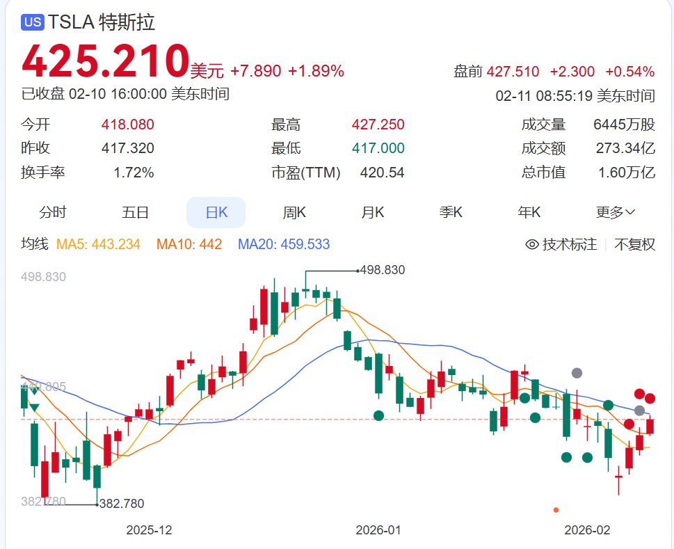 截至2月10日收盘,特斯拉股价报425.21美元,总市值1.6万亿美元。公司股价去年涨超11%,但振幅巨大,最低曾低至214美元,最高曾超过498美元。