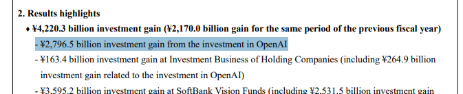 财报写道,软银集团已向OpenAI累计投资了超300亿美元,持有后者约11%的股份。受OpenAI估值上升影响,在去年4月份至12月份期间,这笔投资录得约2.8万亿日元(约合182亿美元)的账面收益。