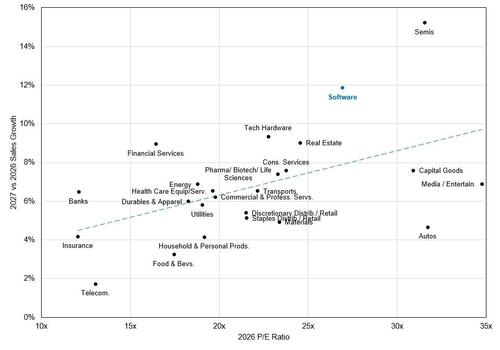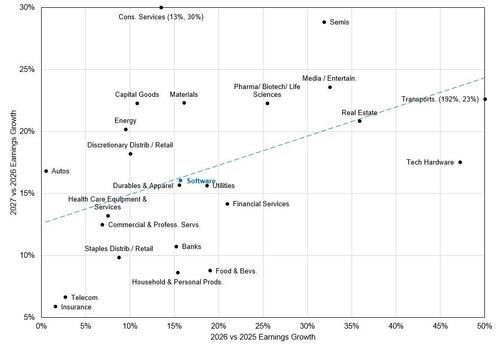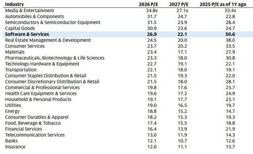 从盈利增长角度观察,2026年与2025年、2027年与2026年的预期增长率并无差异。软件板块这两年的盈利增速均预计达到约16%。这可能表明股票投资者对软件行业的估值标准正在转变,无法再为其不合理地高于其他行业的市盈率提供依据。