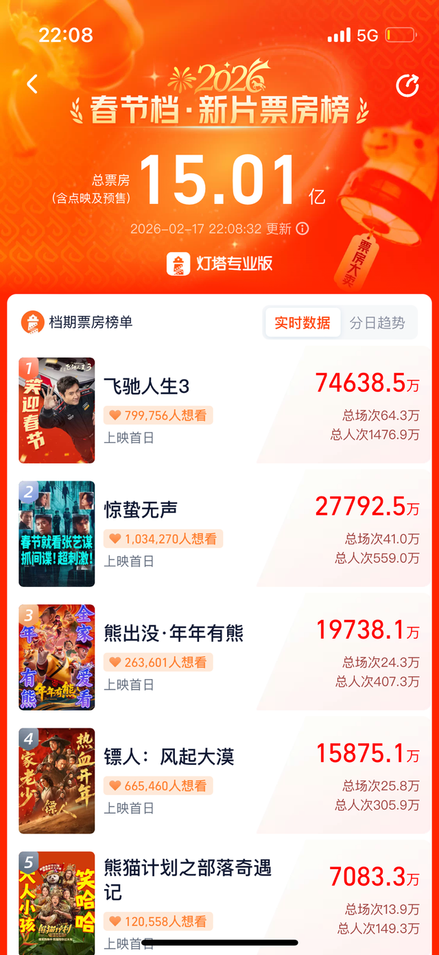 据大麦娱乐旗下灯塔专业版数据,截至2月17日21时,2026大年初一票房12.31亿元,到22时,春节档总票房已突破15亿元。仅《飞驰人生3》票房超6亿元,成为2026大年初一票房冠军。