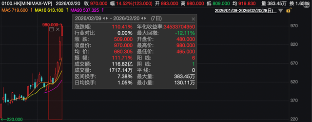 2月以来,“大模型双雄”的智谱和MiniMax涨势喜人。截至2月20日港股收盘,智谱2月累计涨幅超220%,MiniMax 2月以来股价涨幅超105%。
