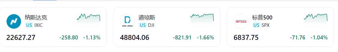 美股三大指数2月23日收盘全线下跌。截至收盘,道琼斯工业平均指数比前一交易日下跌821.91点,收于48804.06点,跌幅为1.66%;标准普尔500种股票指数下跌71.76点,收于6837.75点,跌幅为1.04%;纳斯达克综合指数下跌258.8点,收于22627.27点,跌幅为1.13%。