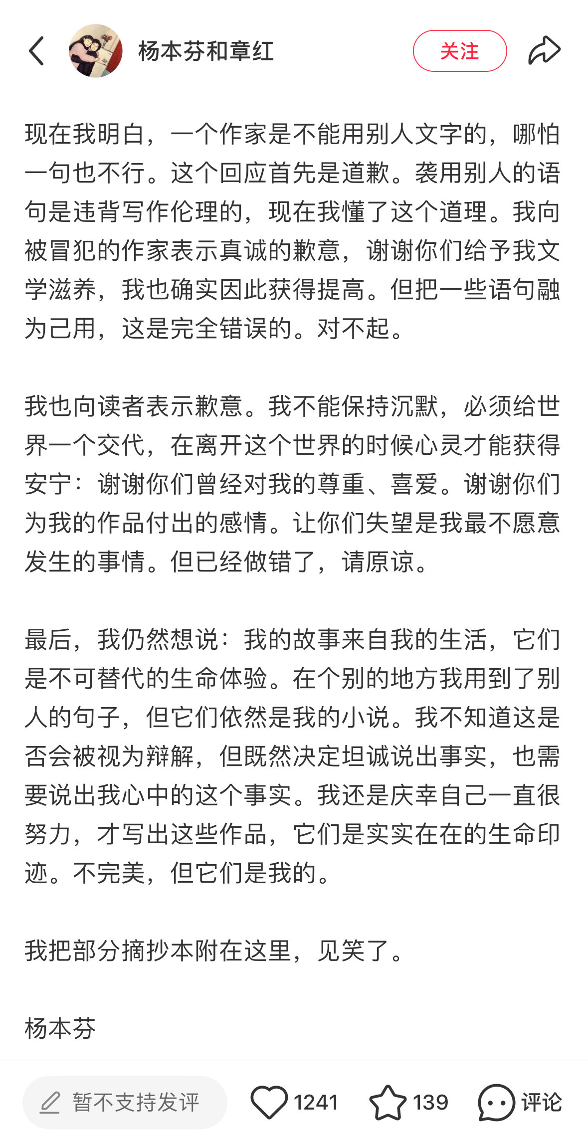 杨本芬社交媒体账号回应截图