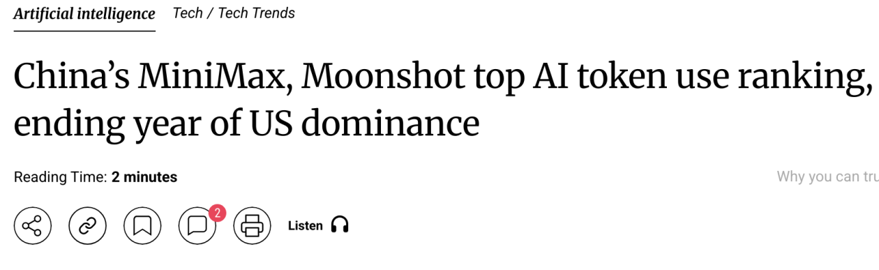【环球网财经综合报道】据南华早报等媒体报道,全球AI模型应用格局迎来重要转变。AI托管平台OpenRouter数据显示,MiniMax、Moonshot AI(月之暗面) 等中国开源人工智能模型,在全球Token使用量排名中位居前列,终结美国开发者长达一年的市场主导地位,国际市场对中国开源模型需求显著提升。
