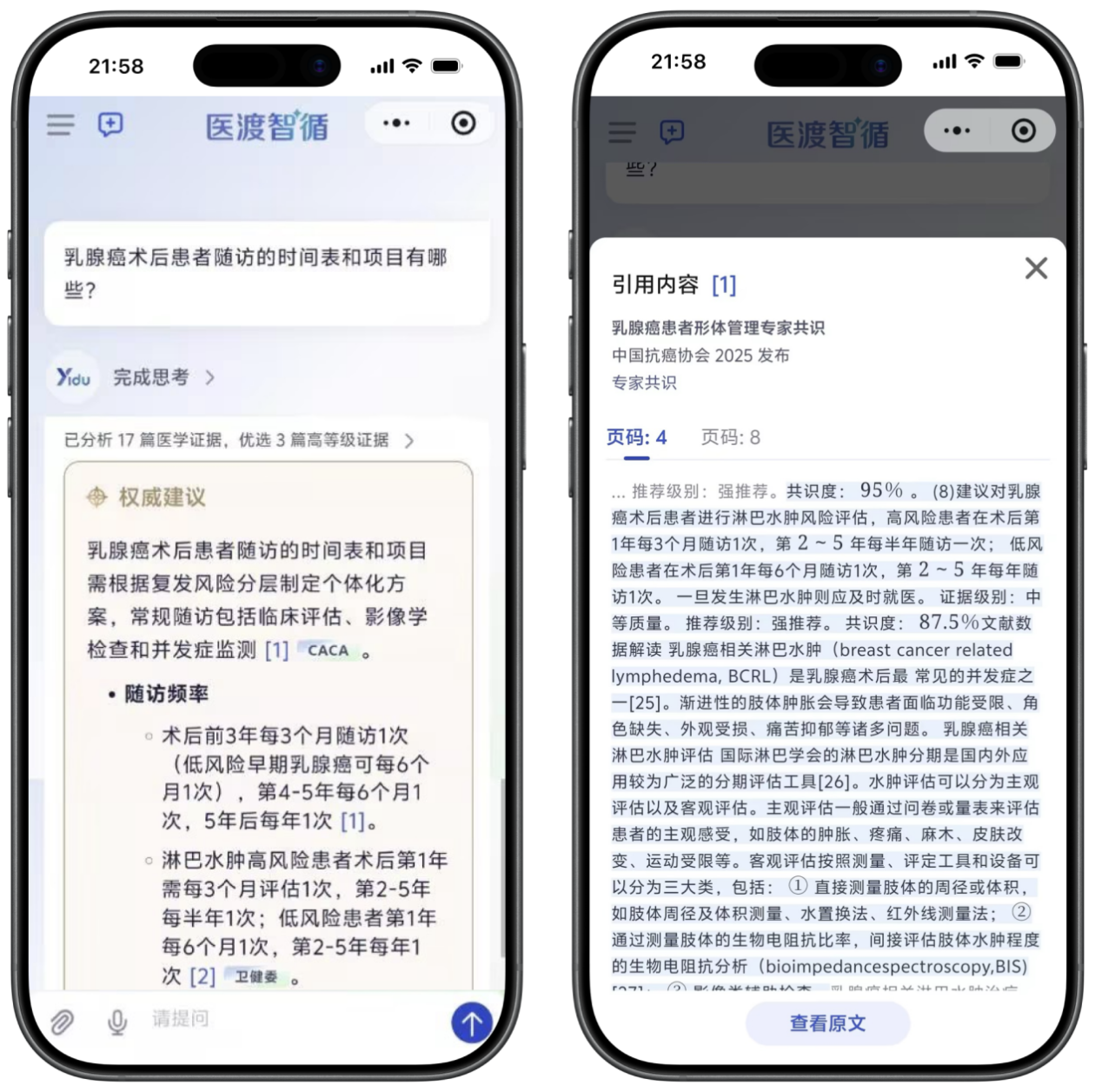 在临床场景中,医生需要的不是模糊结论,而是可验证、可追溯的证据支持。“医渡智循”通过自动化执行证据检索、分级评估与逻辑整合流程,将AI生成过程完全透明化。每一次回答均附带原始文献或指南出处,医生可一键跳转核查原始资料。