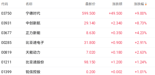 截至收盘,宁德时代(03750.HK)涨9%、中创新航(03931.HK)涨8.73%、比亚迪电子(00285.HK)涨2.91%。
