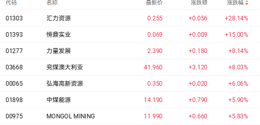 截至收盘,汇力发展(01303.HK)涨28.14%、兖煤澳大利亚(03668.HK)涨8.03%、中煤能源(01898.HK)涨5.90%。