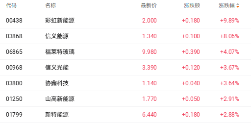 截至收盘,信义能源(03868.HK)涨8.06%、福莱特玻璃(06865.HK)涨4.07%、协鑫科技(03800.HK)涨3.64%。