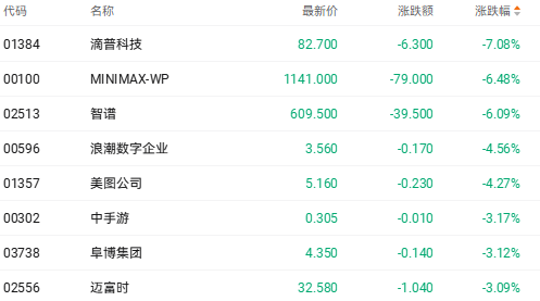 截至收盘,MINIMAX-WP(00100.HK)跌6.48%、智谱(02513.HK)跌6.09%、美图公司(01357.HK)跌4.27%。