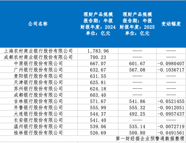 2025年,仅深圳农村商业银行、广东华兴银行等7家银行的理财产品规模实现小幅增长,其余银行自营理财规模普遍下滑。例如,中原银行理财规模由2024年的667.07亿元下降至601.67亿元;广州银行则从632亿元降至567亿元,同比减少10.36%。