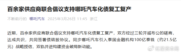 红星资本局注意到,3月11日是哪吒汽车在申请延期后提交最终重整计划草案的法定最后期限,公司目前仍未发布重整计划草案的相关公告。