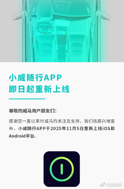 2025年11月,威马汽车在微博宣布:“好事将近,敬请期待。”随后官方APP“小威随行”上线,蓝牙车控、蓝牙钥匙、远程车控、车辆信息同步等功能恢复,但仅支持威马EX5、EX6车型。