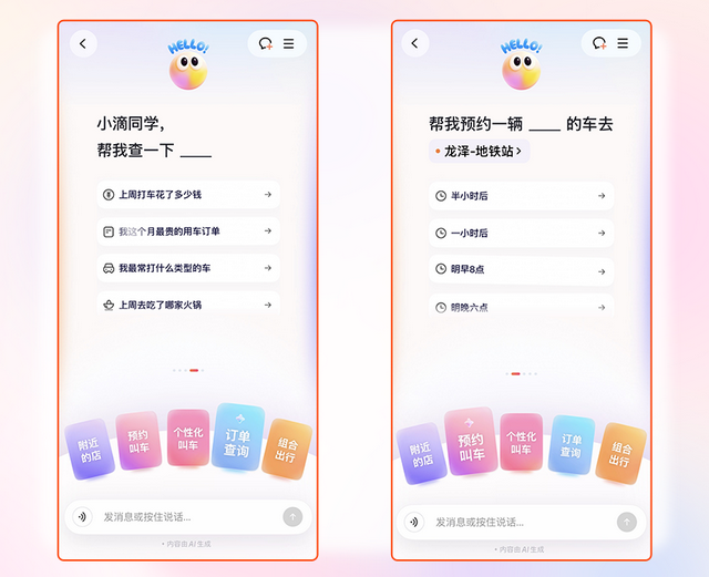 除了一句话选车,小滴也在向更完整的出行助手延展。它也支持查询附近地点并一键叫车、推荐远距离行程的换乘方案,以及查询订单、预约叫车等功能。
