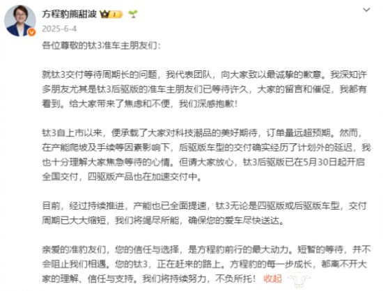 针对钛3交付周期延长的问题,2025年6月 4日,比亚迪方程豹事业部总经理熊甜波在社交平台发文公开道歉,称由于订单量远超预期,加上产能爬坡及手续等因素影响,后驱版车型交付出现了计划外的延迟。